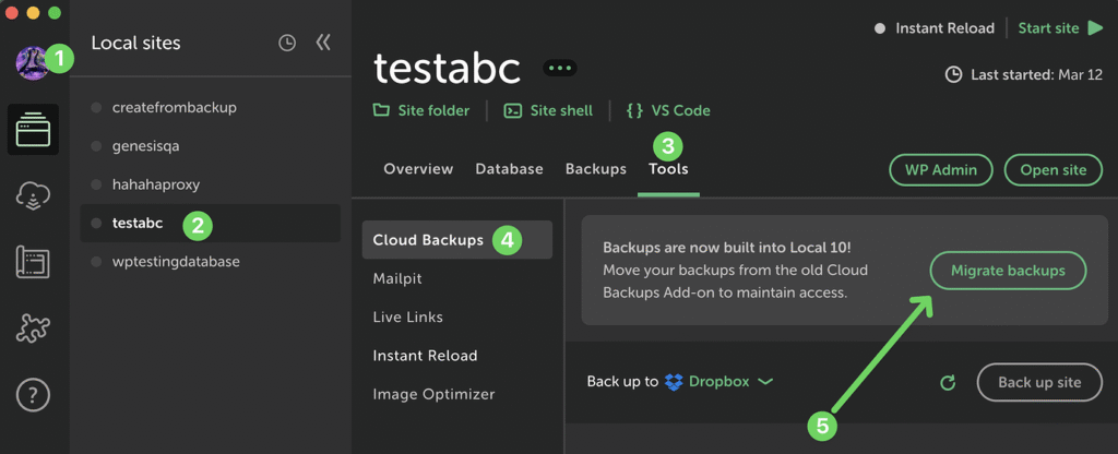 - Make sure you are logged in to Local for the migration (select “log in” from the person icon in the top-left). Visit any of your existing sites, go to Tools → Cloud Backups, and click the “Migrate backups” prompt. This will migrate all your backups, not just those for the site you’re currently viewing.
