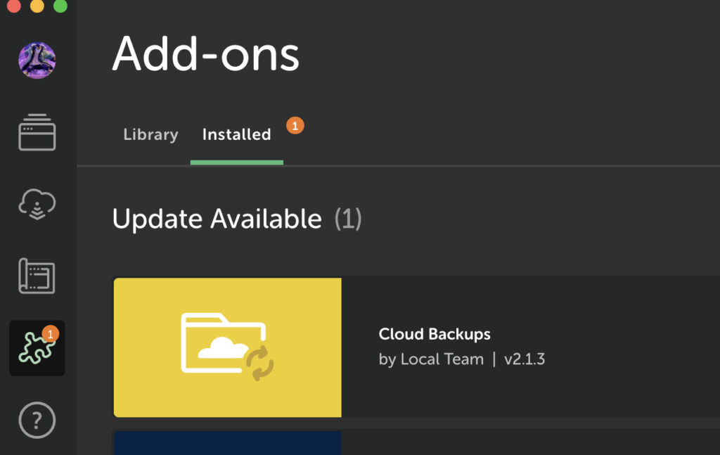 If you’re an existing Cloud Backups add-on user, you’ll need to migrate your backups before you see them in backup section of Local (v10 or newer). Once your backups are migrated, you’ll also be free to delete the add-on. Here are the steps:
